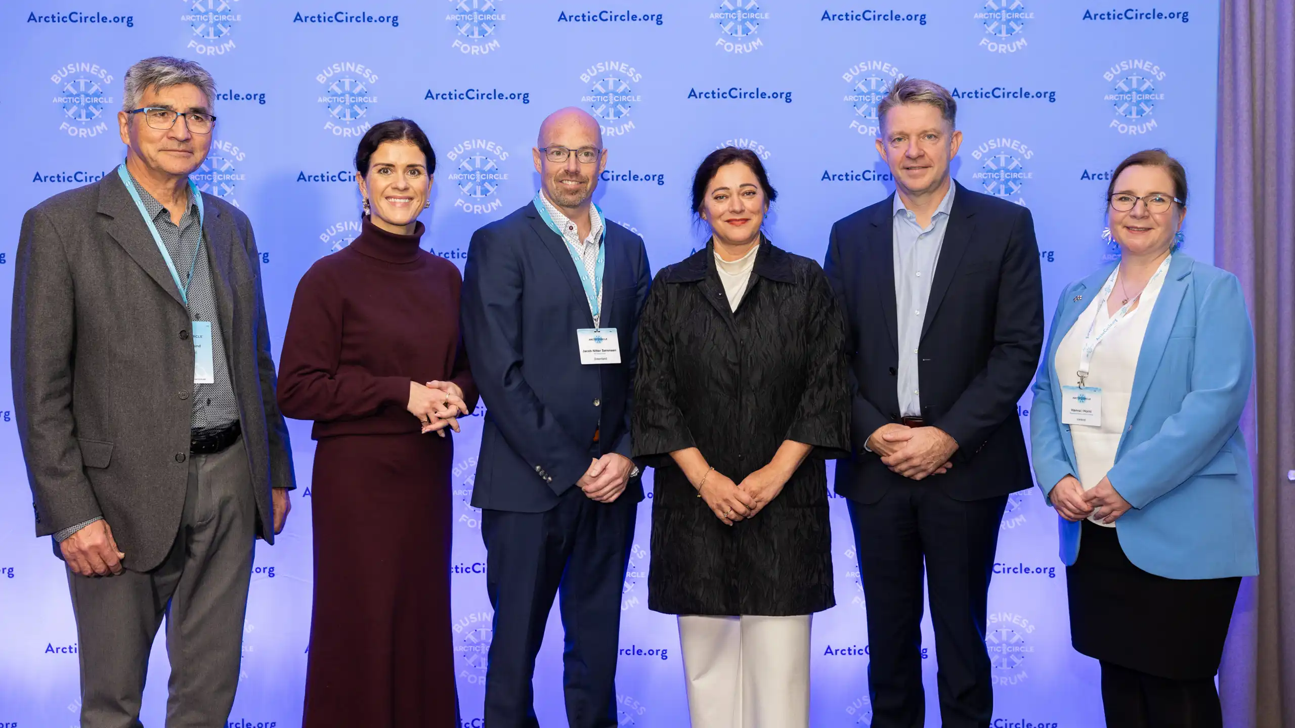Fra venstre: Kalistat Lund, Naalakkersuisoq for Landbrug, Selvforsyning, Energi og Miljø, den islandske udenrigsminister, Thórdís Kolbrún Reykfjörd Gylfadóttir, Air Greenlands administrerende direktør, Jacob Nitter Sørensen, Atlantic Airways administrerende direktør, Jóhanna á Bergi, Icelandairs administrerende direktør, Bogi Nils Bogason og yderst til højre, er Hanna í Horni, Færøernes repræsentationschef i Reykjavik. Foto: Arctic Circle Assembly