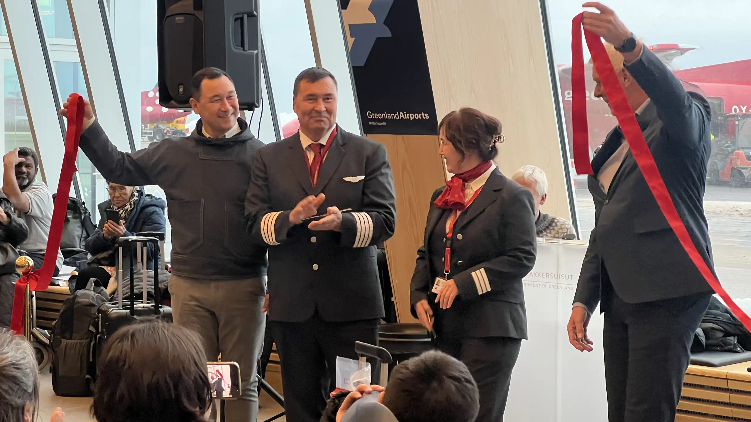 Inden han og de forventningsfulde rejsende kunne komme afsted, var to taler tilbage, den ceremonielle del med klipning af snoren og fotograferingen af besætningen på den første ruteflyvning mellem København og Nuuk.